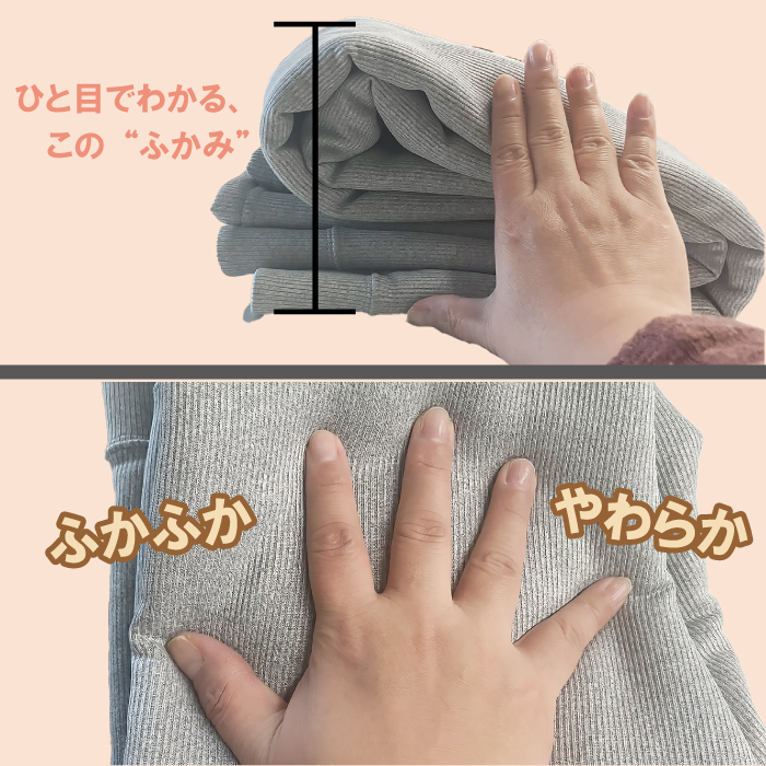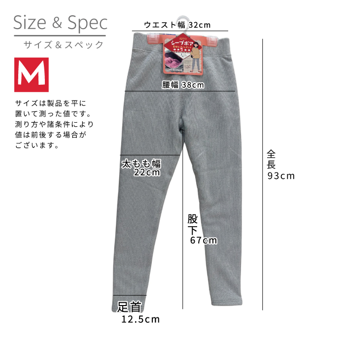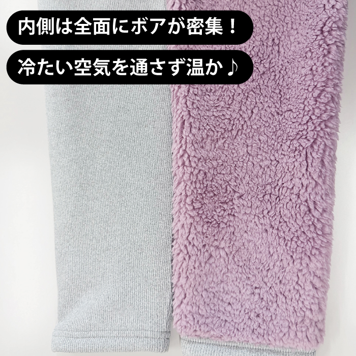 | 特徴 | 裏地にはモコモコのボア生地が隙間なくびっしり! 冷気を通さず温かさキープ! お腹まで全面ボア生地だから、冷えにくく温活にも便利♪ 表地は柔らかいカットソー風の生地だから 履きやすくリブになっているので重ね着しやすい、すっきりシルエットです。 |